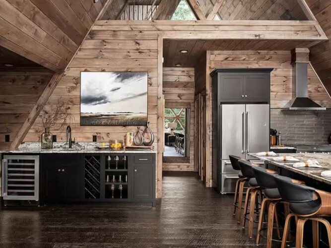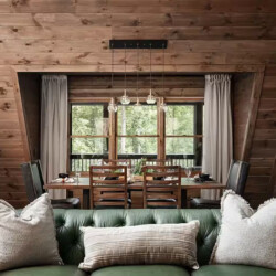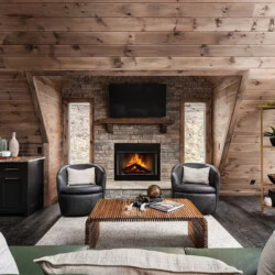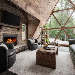 Step inside to a sanctuary of calm colors and elevated textures: soft beige, deep greens, stone, and wood flowing together in warm harmony. The great room opens skyward, sunlight pooling across polished finishes. Here, mornings start slow with espresso by the fire, vinyl spinning, steam rising from a mug while the forest wakes with you.