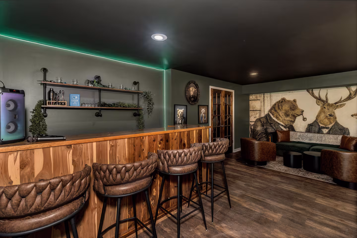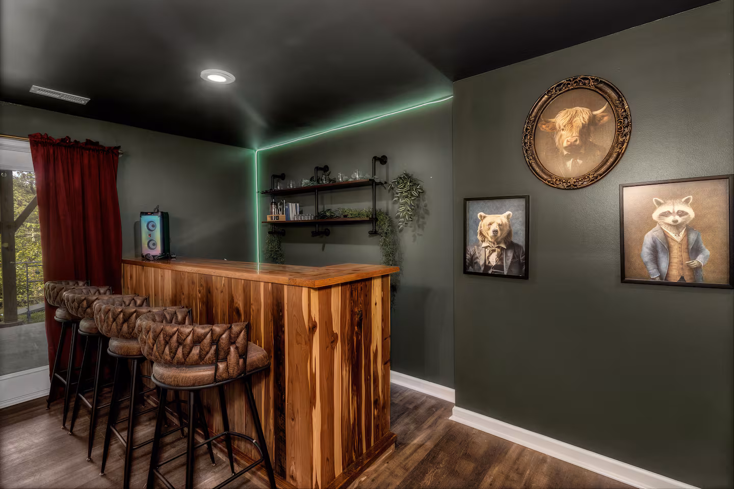 You just found your dream escape: Modern mountain w/ Asheville vibes + nonstop fun. Recently remodeled and tucked away in a cul-de-sac, 12 minutes from downtown, this dog friendly, 5-bedroom retreat is packed with entertainment: a movie theater, arcade games, speakeasy dry bar, & tons of indoor and outdoor games including mini putt! If you’re relaxing in the hot tub, cozying up by the fire pit, or hosting a pool showdown, this home is designed for making family memories w/ groups of all ages!