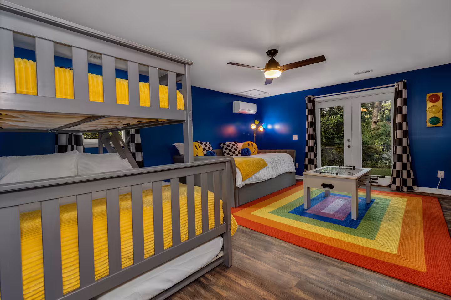 Perfect for families or kids, this spacious room offers a queen daybed, single bed, and bunk bed, along with a 43” Roku TV, blackout shades, memory foam comfort, and USB outlets for a comfortable stay. Temperature controlled by its own mini-split.