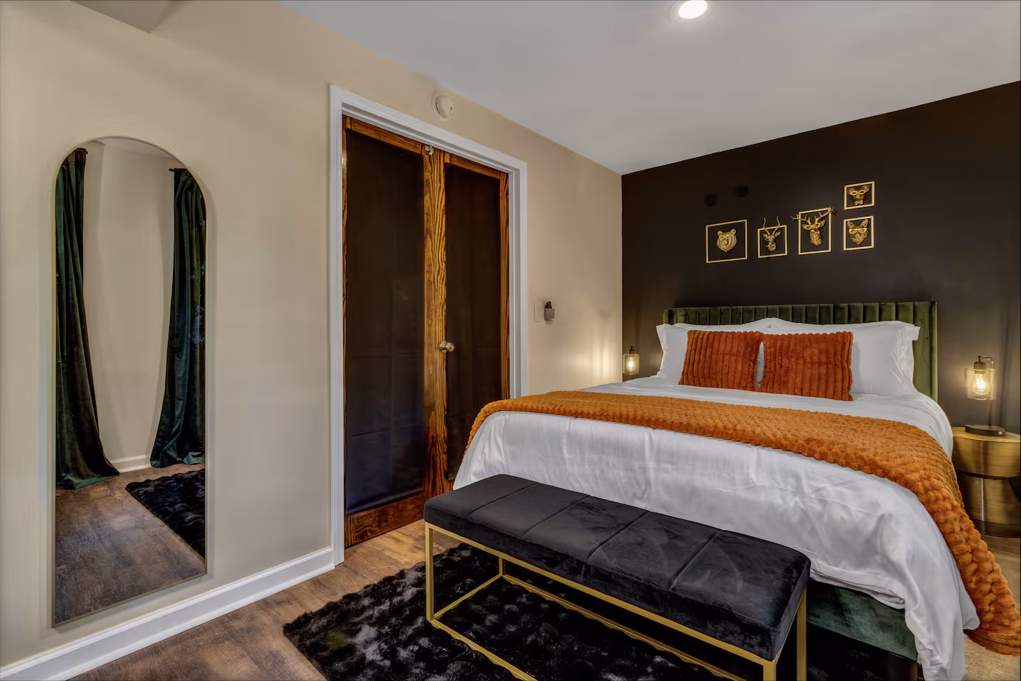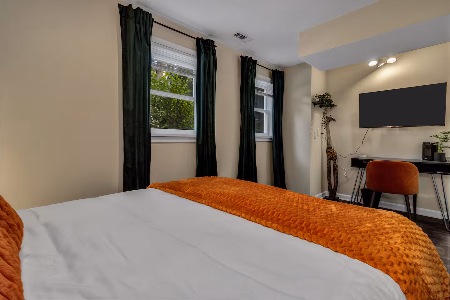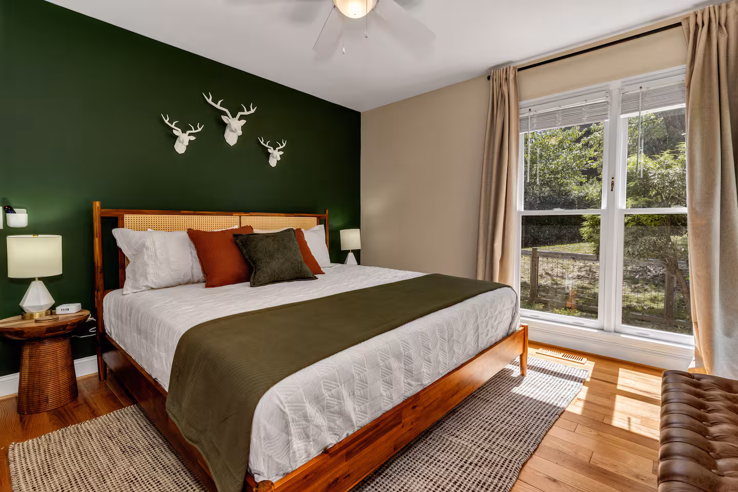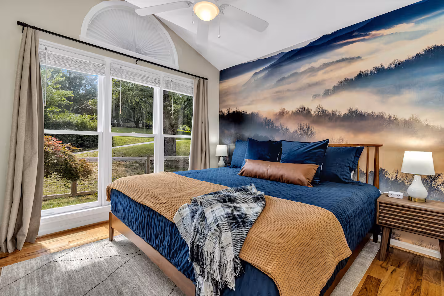 This inviting room offers a king bed with a 43” Roku TV, blackout shades, memory foam mattress, and USB outlets, providing a peaceful retreat after your Asheville adventures.