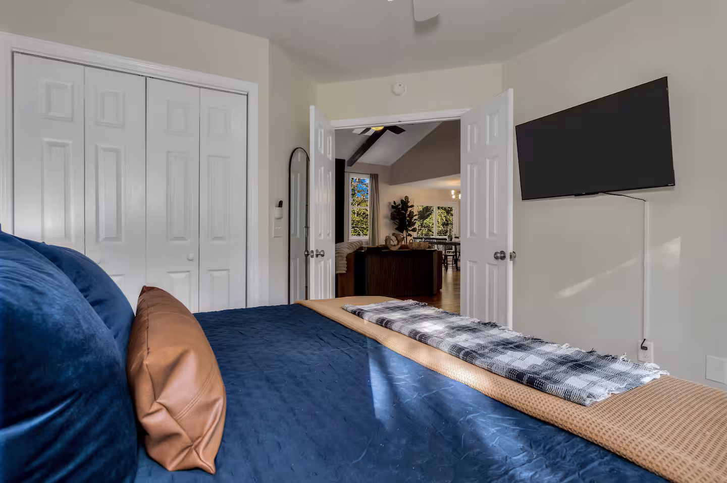 Featuring a queen bed, 43” Roku TV, blackout shades, a dedicated desk for remote work, memory foam comfort, and USB outlets. This downstairs bedroom is ideal for relaxation or productivity. Temperature controlled by the great room downstairs minisplit and additional portable fan/heater.