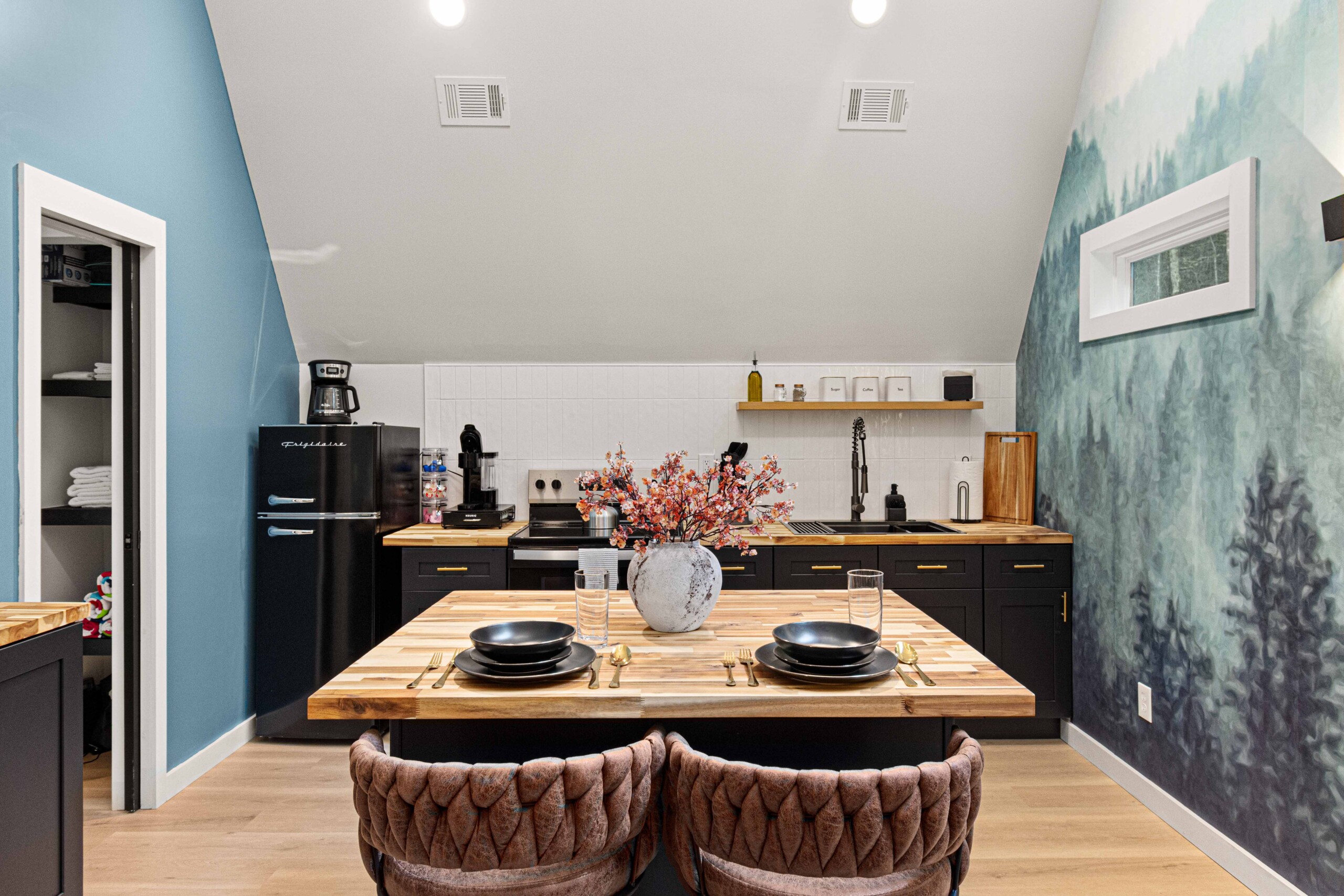 Step inside and feel an immediate sense of calm. The open-concept living area features soaring ceilings, warm wood accents, and a sleek electric fireplace that casts a gentle glow across the room. The kitchen is fully equipped with everything you need to prepare meals at home – from a Keurig and drip coffee maker for your morning brew to quality cookware, wine glasses, and a full-size oven for evening dinners. Large windows frame the surrounding forest, allowing natural light to pour in while maintaining a cozy, secluded feel.