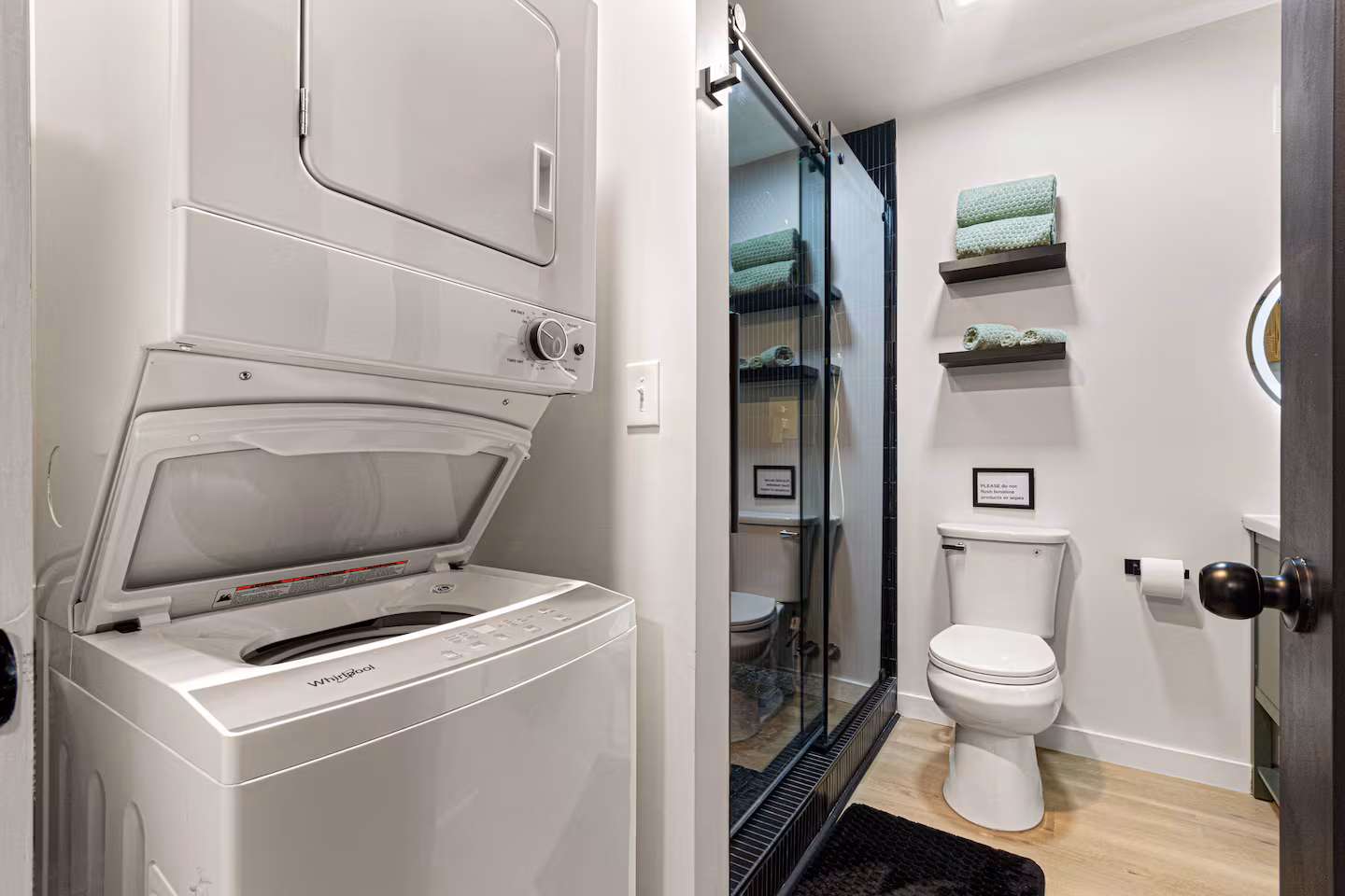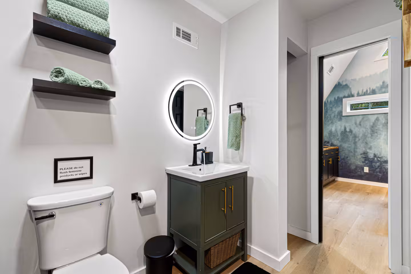 The main floor bedroom offers a plush queen bed and direct access to the back deck – the perfect spot to sip coffee as sunlight filters through the trees. Upstairs, a private loft holds a second queen bed tucked beneath the A-frame’s slanted roof, ideal for curling up with a book or gazing out at the forest beyond. The full bathroom includes fresh linens, a washer and dryer, and thoughtful touches to make your stay comfortable and convenient.