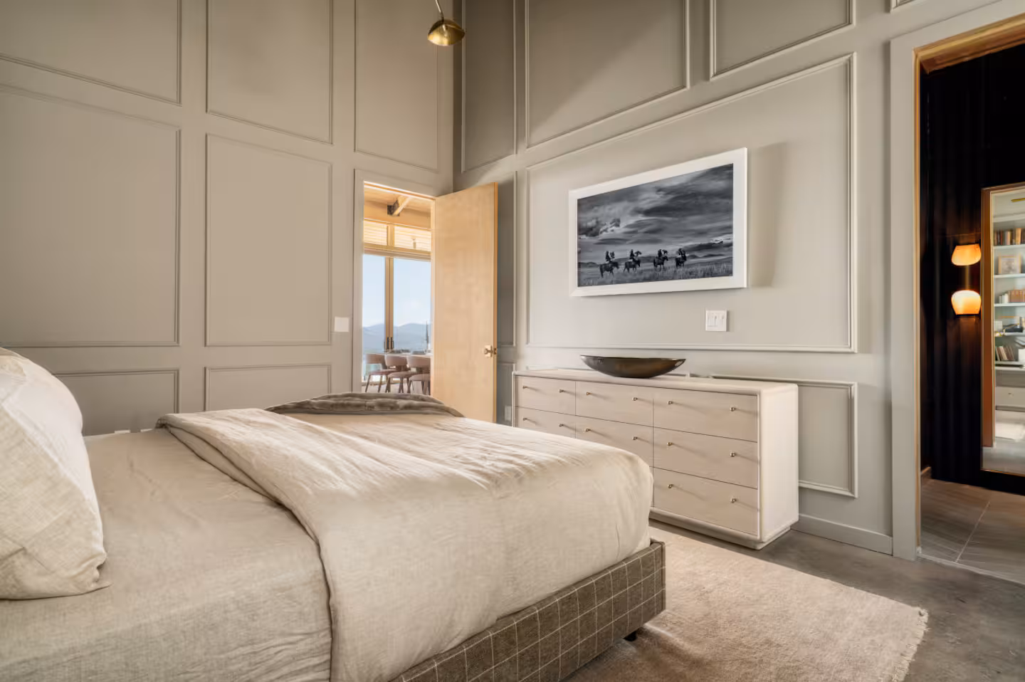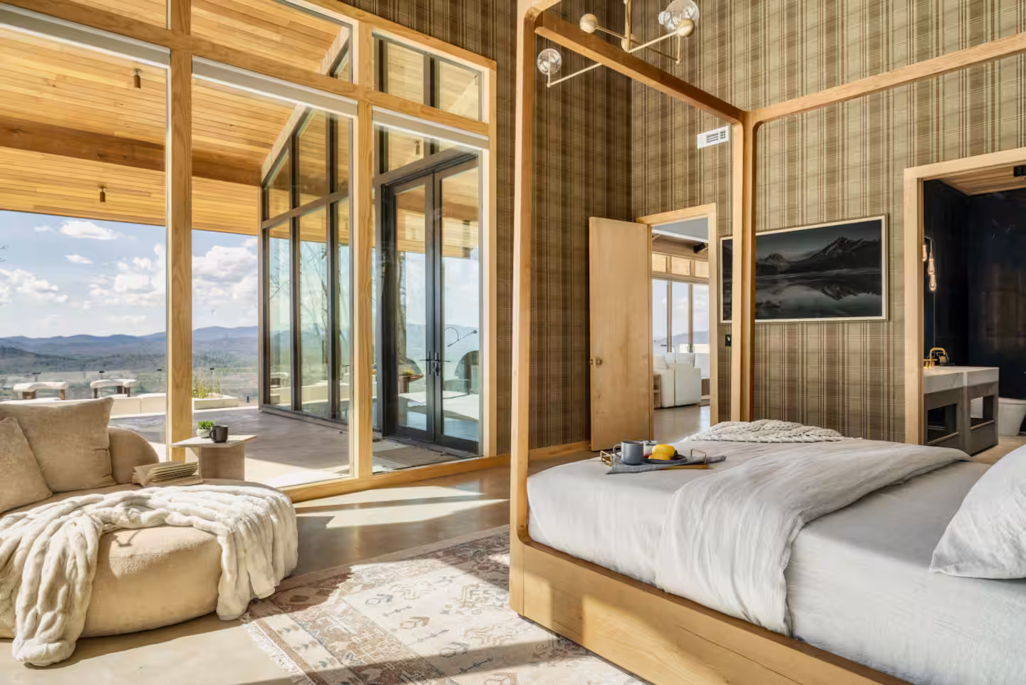 Step into The Glass Frame and be instantly immersed in its contemporary open-concept design, featuring exposed wooden beams, polished concrete floors, and sleek furnishings. Floor-to-ceiling glass walls flood the space with natural light and mountain views, seamlessly blending indoor comfort with the beauty of the outdoors.