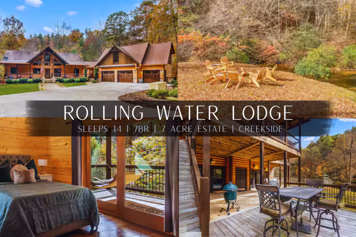 Welcome to Rolling Water Lodge! This completely private 7 acre estate comes with a large, true log home, creek and land to enjoy. The home is situated on a peninsula of land with a babbling creek that wraps around on three sides. Creating a you own unique, and private mountain water setting. It is extremely secluded yet only 13 minutes to downtown Ellijay. This cabin has 6 bedrooms plus a sleeping loft to comfortably accommodate 14 guests. Book now before its too late!