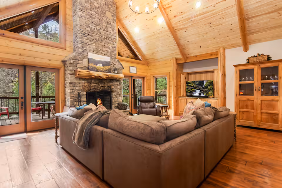 The main living area of the cabin centers around a grand indoor wood burning fireplace ( please bring your own firewood), which provides warmth and a cozy ambiance, ideal for gatherings on chilly evenings. The spacious open-concept living room flows seamlessly into the dining area ( seats up to 9 people) and a well-appointed kitchen, making it easy for family and friends to gather, share meals, and enjoy each other’s company. Our kitchen has the largest fridge that GE offers plus a mini fridge to accommodate all of your groceries. In addition the home offers 1 Wolf and 2 LG ovens for making family meals. The Adults can enjoy the upstairs living space while the children are downstairs enjoying a large selection of board games or watching their favorite movie on the downstairs tv.