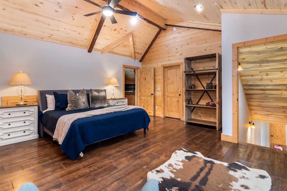 The cabin itself is a masterpiece of rustic elegance and comfort, designed to be both luxurious and cozy. With six spacious bedrooms plus a kids sleeping loft, it has ample room for a large family or a group of friends, each room crafted with unique charm and character. The natural wood interiors, large windows, and thoughtful design details blend seamlessly with the surrounding environment, bringing the outdoors in and letting you enjoy nature from every corner of the cabin.