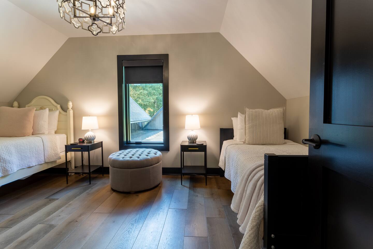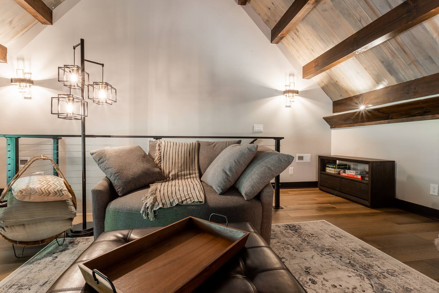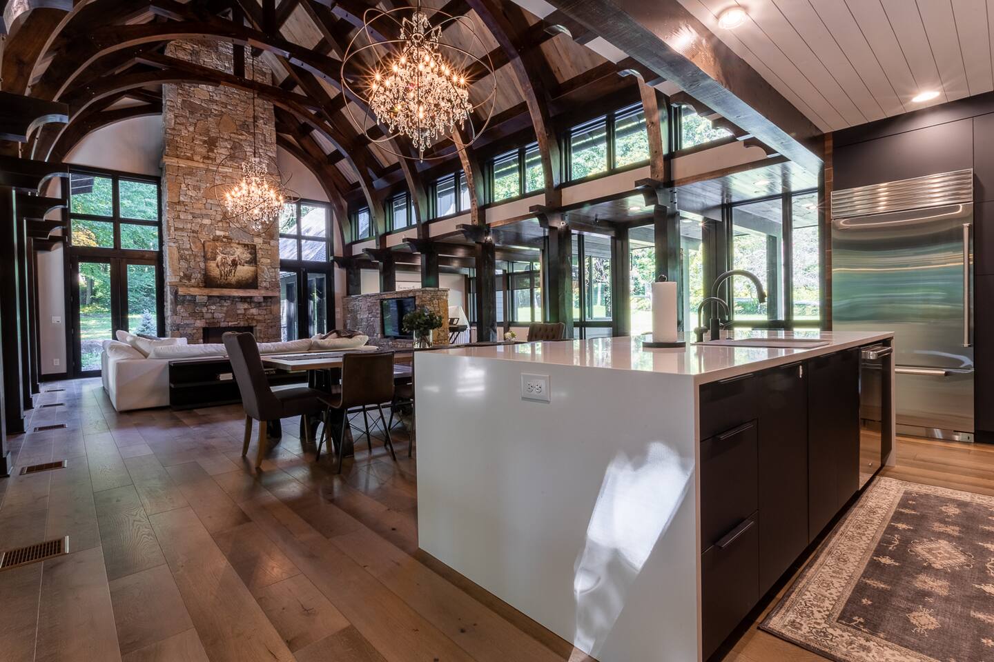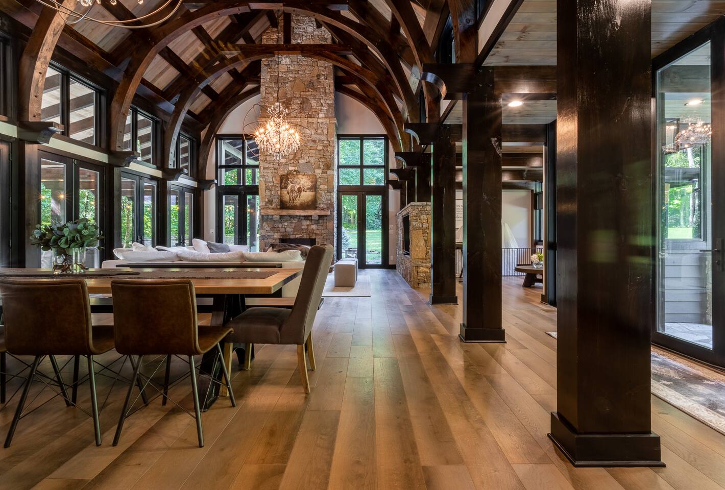 Indulge in the comfort and luxury of the Modern Mountain Creekhouse. After a day of exploration, unwind in the grand living room by the fireplace, surrounded by high ceilings, stunning architectural details, and breathtaking chandeliers. For a quieter retreat, the loft offers a cozy reading nook. The fully equipped kitchen with high-end finishes is perfect for preparing meals to enjoy on the patio, complete with a fire pit for cozy evenings under the stars.