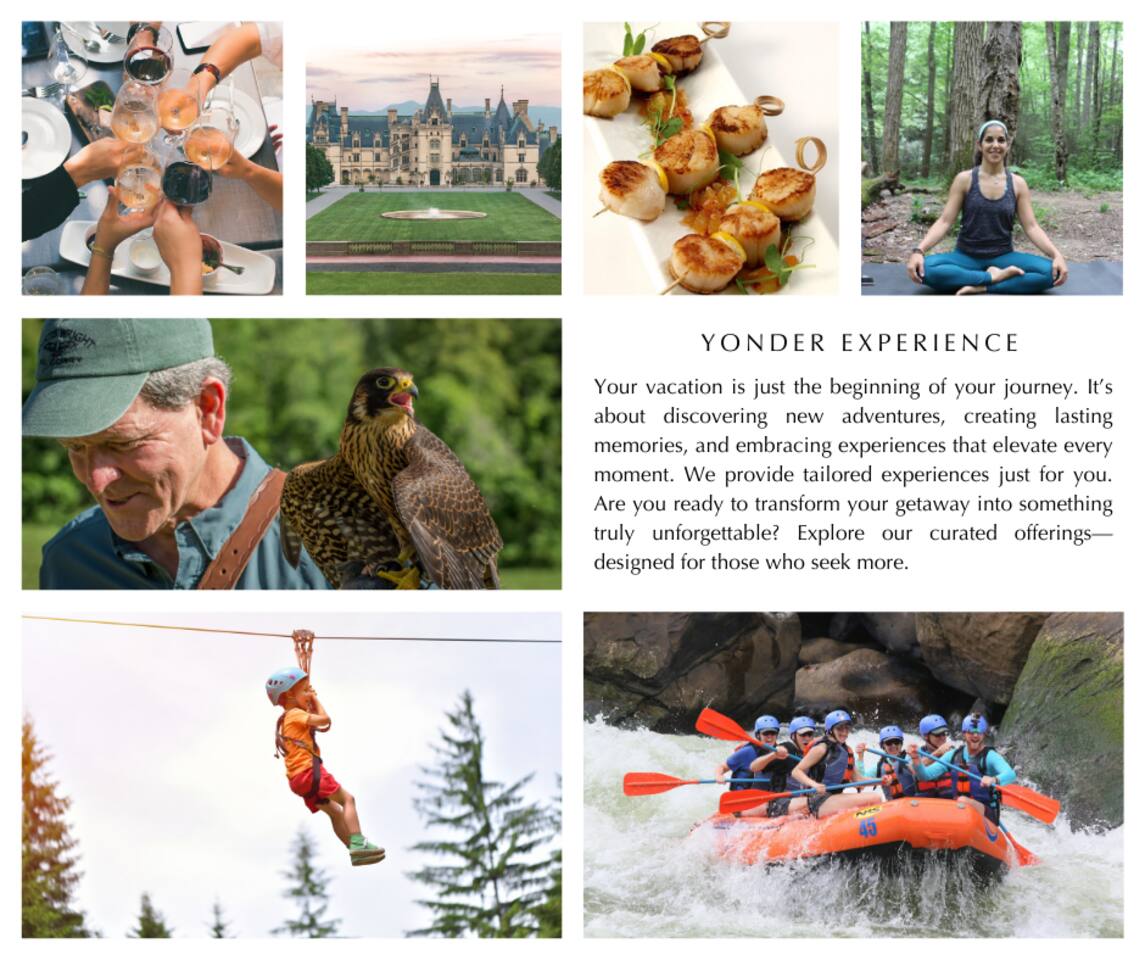 Discover our Yonder Experience Program! Enjoy outdoor adventures, falconry, fly fishing, waterfall tours, and bike rentals. Indulge in in-home chef experiences, art workshops, rooftop bar tours, and axe throwing. Try private scavenger hunts, on-site yoga, and seasonal mini-retreats. Plus, get discounted Biltmore Estate tickets! Learn more about our experiences.