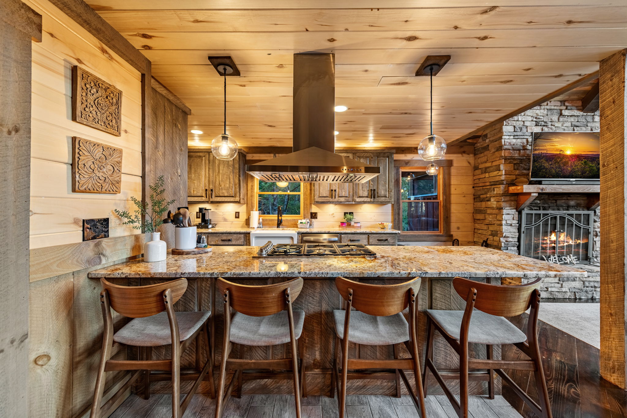 This four-bedroom, three-bathroom cabin is the perfect retreat for groups and families seeking fresh mountain air and river views. Relax on multi-layered decks, enjoy the riverside pavilion, or unwind in a comfortable, fully equipped cabin.