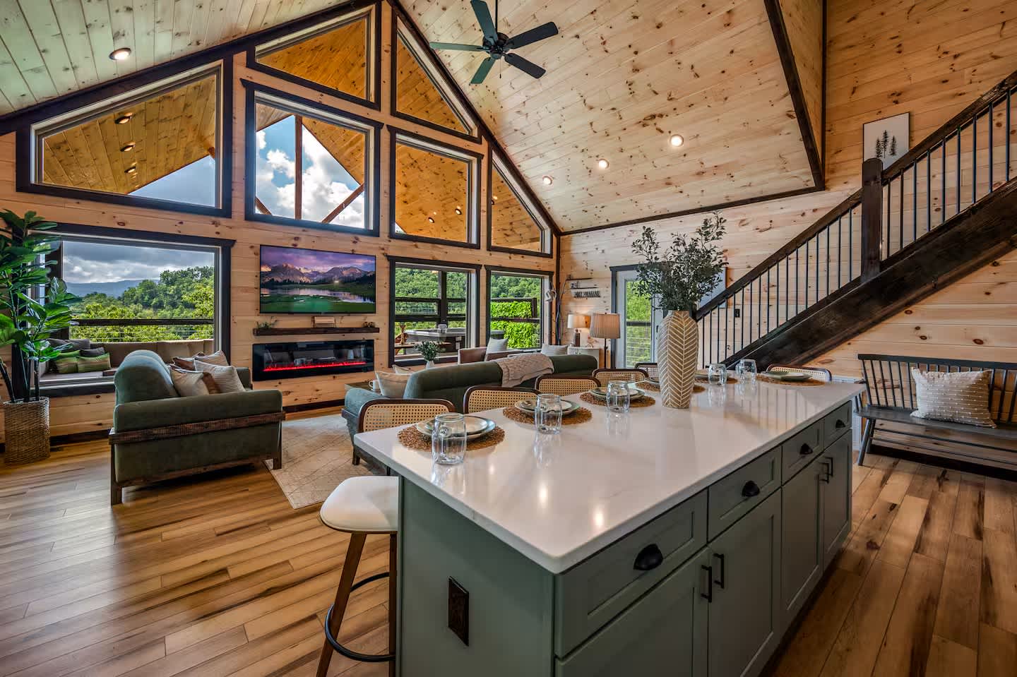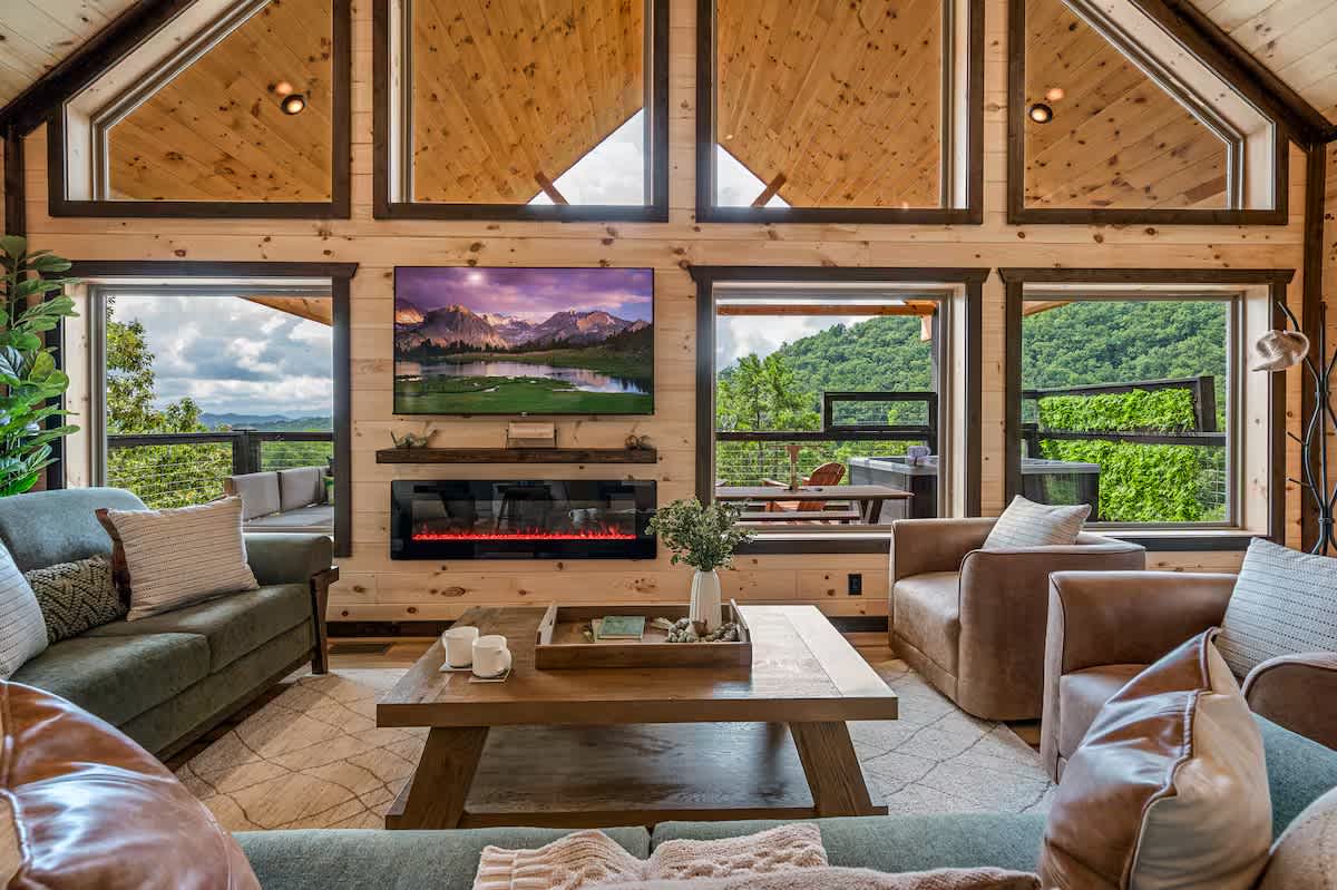 ✨Where You’ll Lounge Main Living Area Kick back beneath vaulted ceilings and soak up the natural light. The cozy sofa setup, 65” smart TV, and electric fireplace make this the perfect spot to relax, reconnect, or binge your latest favorite show. Enjoy year round breathtaking views from the large windows.