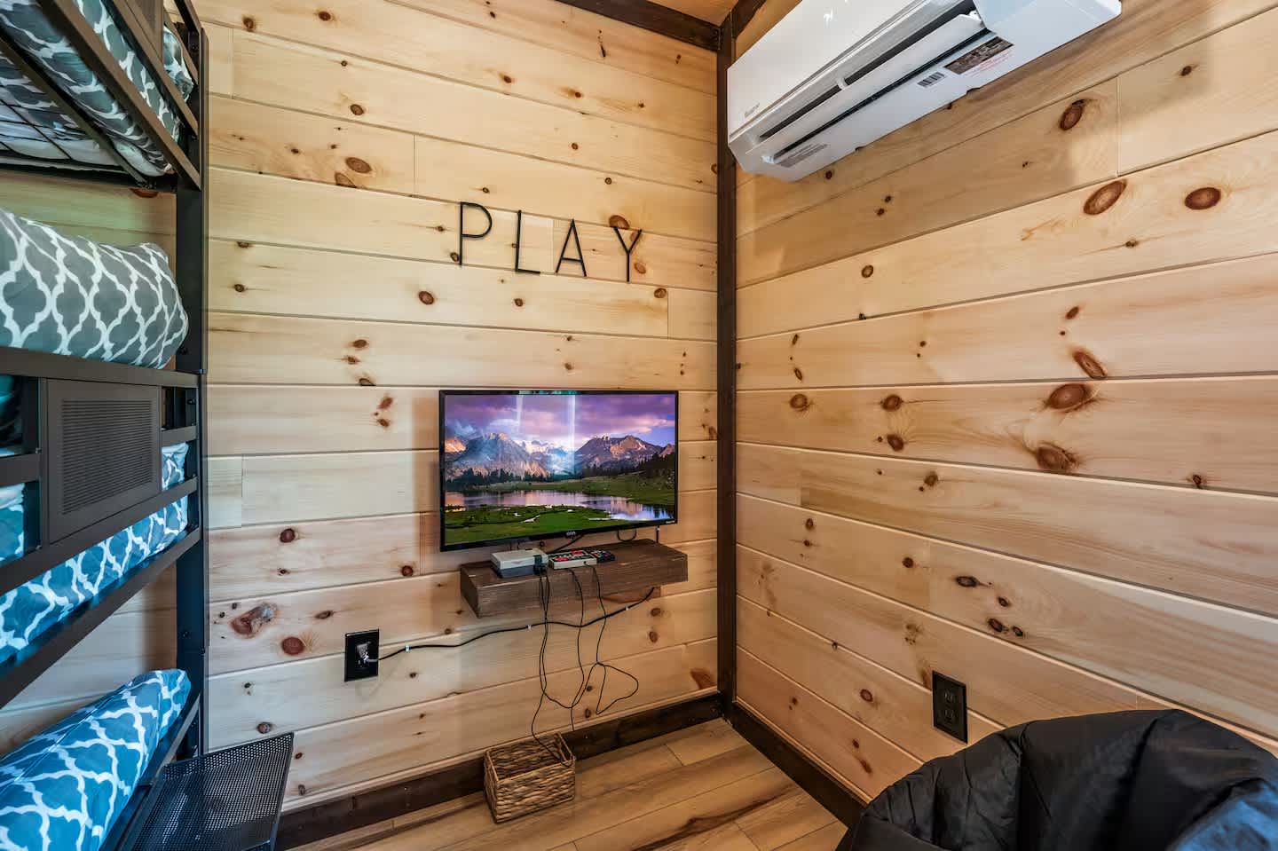 ✨Where You’ll Play Game + Bunk Loft Your upstairs entertainment zone features: -Cozy reading nook -Gaming zone with classic video games - Air Hockey Table - Board Games & Puzzles - That Triple Bunk Bed for Bonus Hangout Space It’s game night, or chill night — your call.