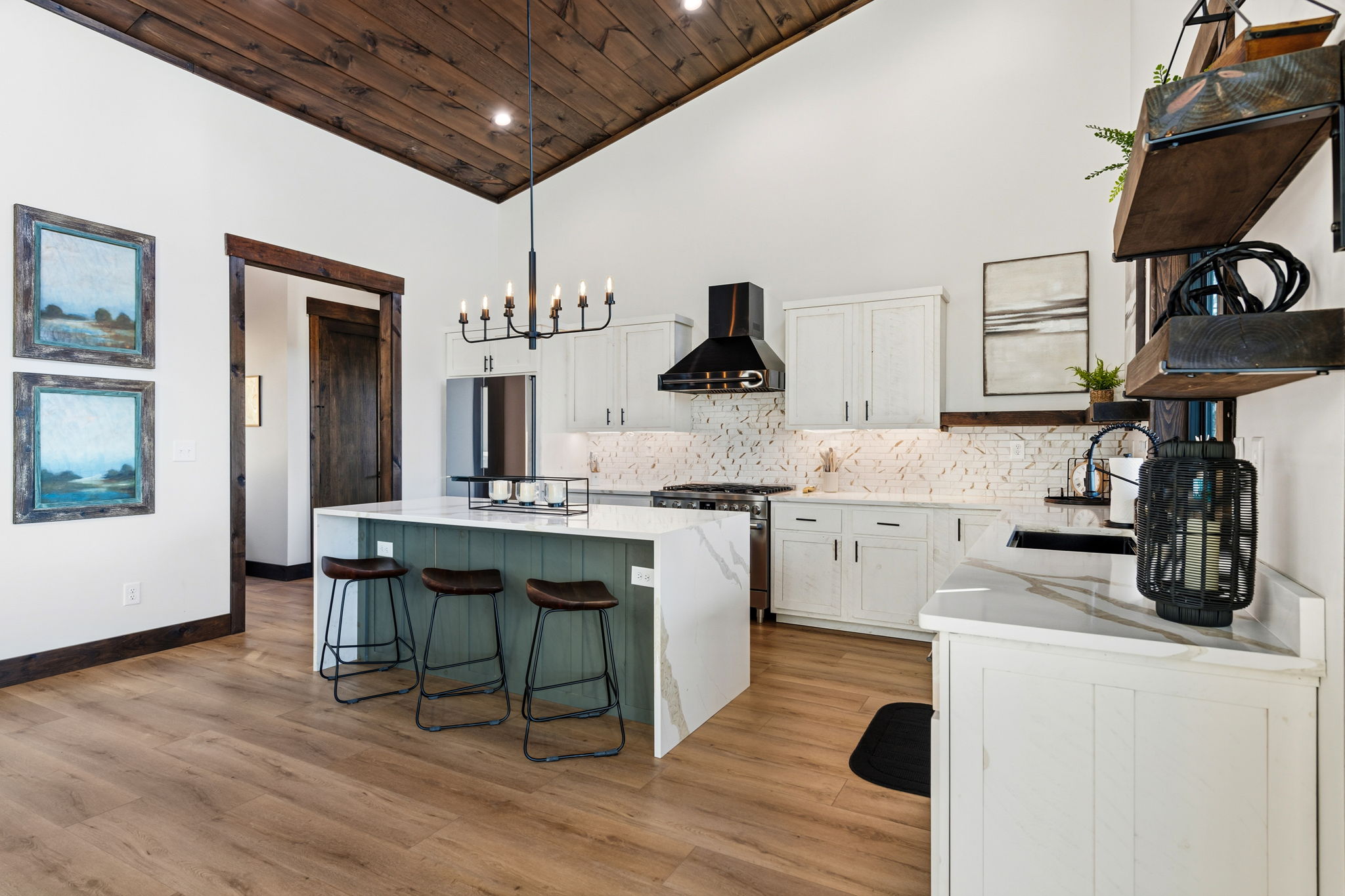 The main level opens into a bright, airy living space designed to inspire connection. Floor-to-ceiling windows frame sweeping infinity views, while the soft gray sofas and gas fireplace create a warm modern lounge atmosphere. The living area flows into the dining table and the elegant kitchen, a balance of white cabinetry, soft green accents, clean lines, and natural light. It’s an inviting space where meal prep feels joyful and every moment feels grounded in the beauty outside.