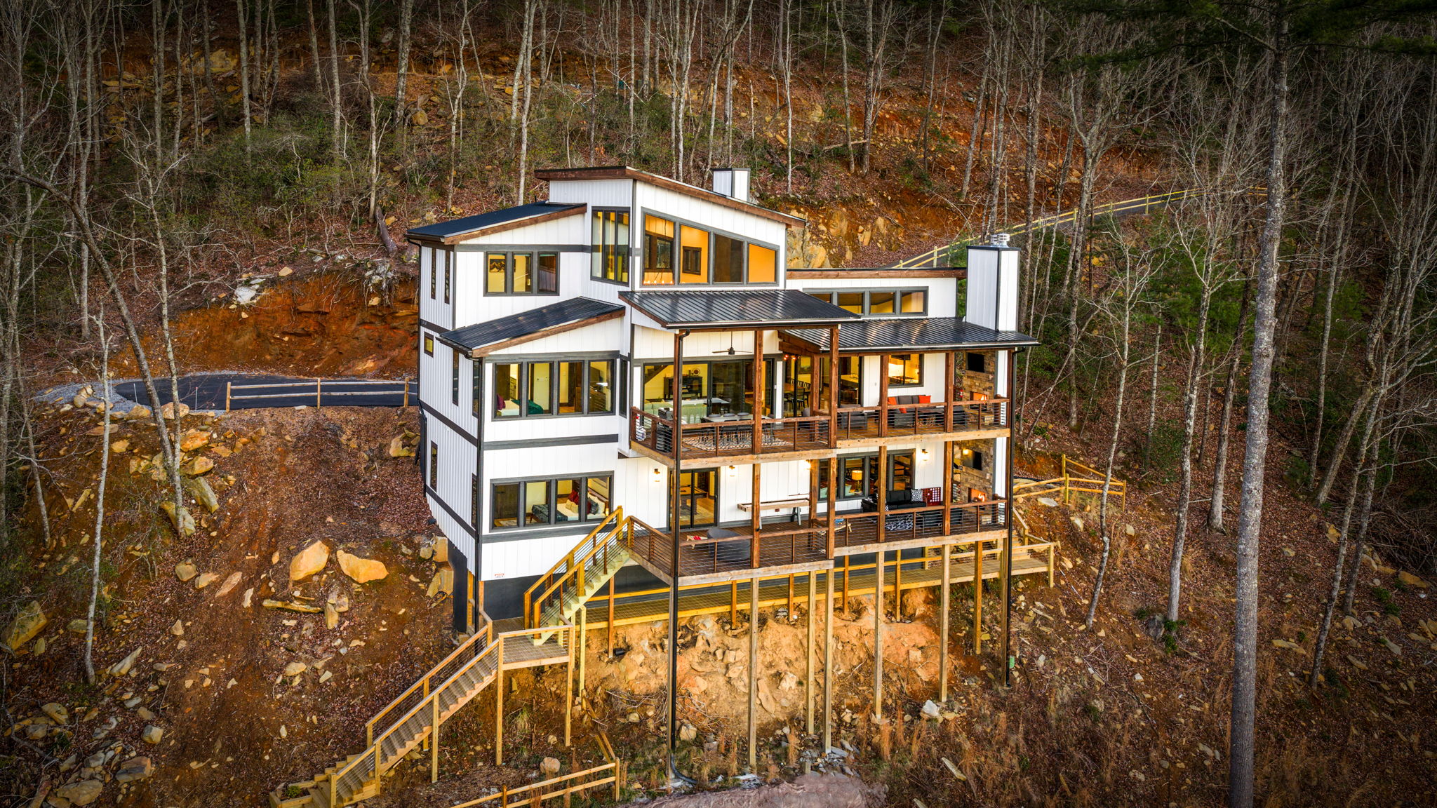 • Three-level modern cabin with sleek, cozy, clean-line design