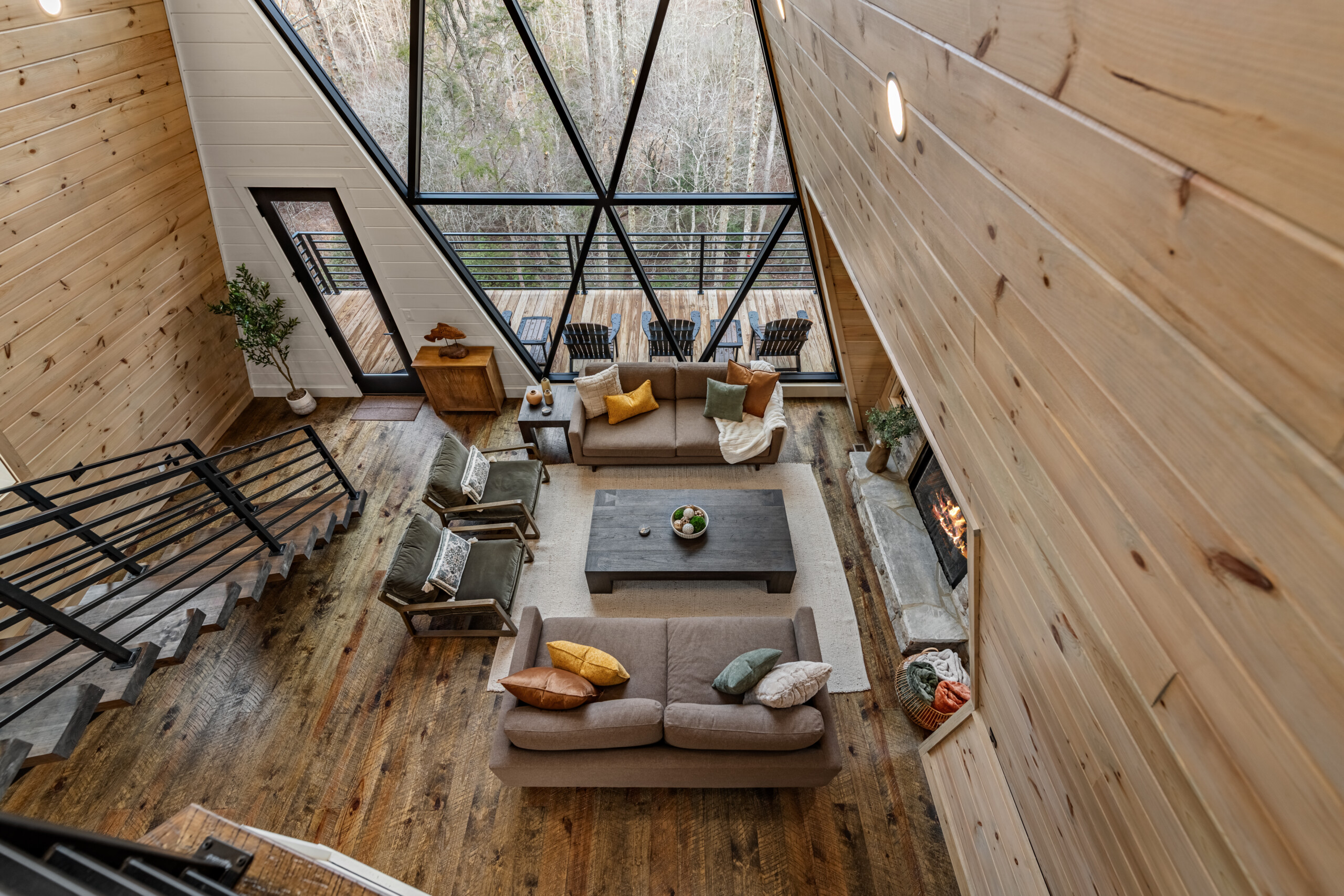 Perched high above Fightingtown Creek, surrounded by towering trees and Blue Ridge serenity, this four-level modern retreat feels like a private escape designed for travelers who love style, comfort, and unforgettable moments. A-List Lodge blends clean modern architecture with cozy cabin warmth, glass walls that frame the forest like artwork, soft earthy tones, and spaces made for connection.