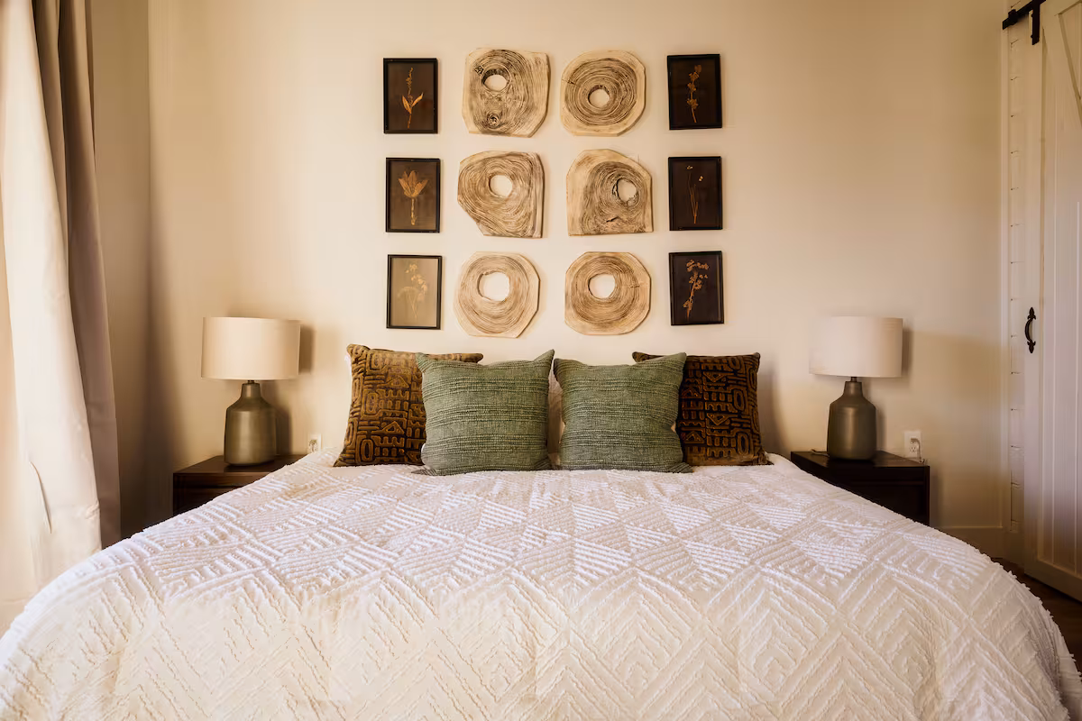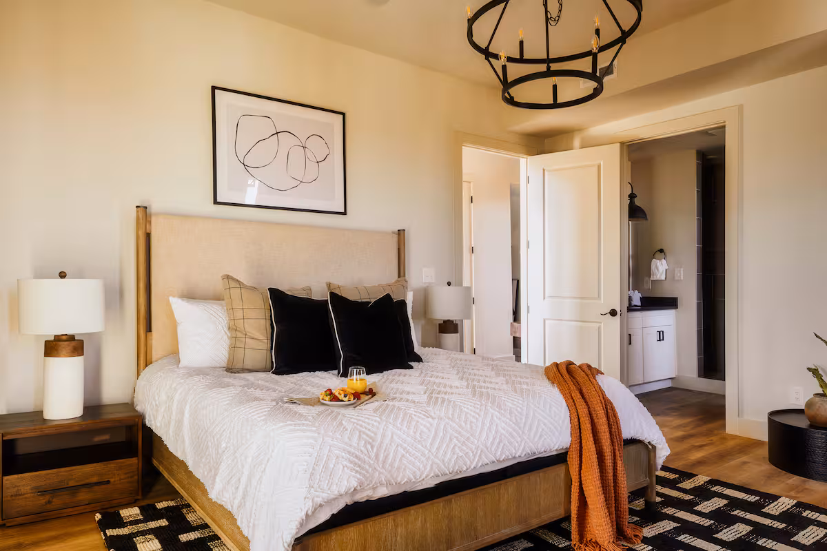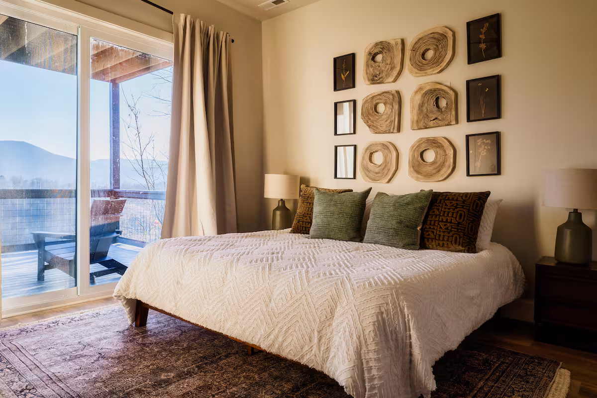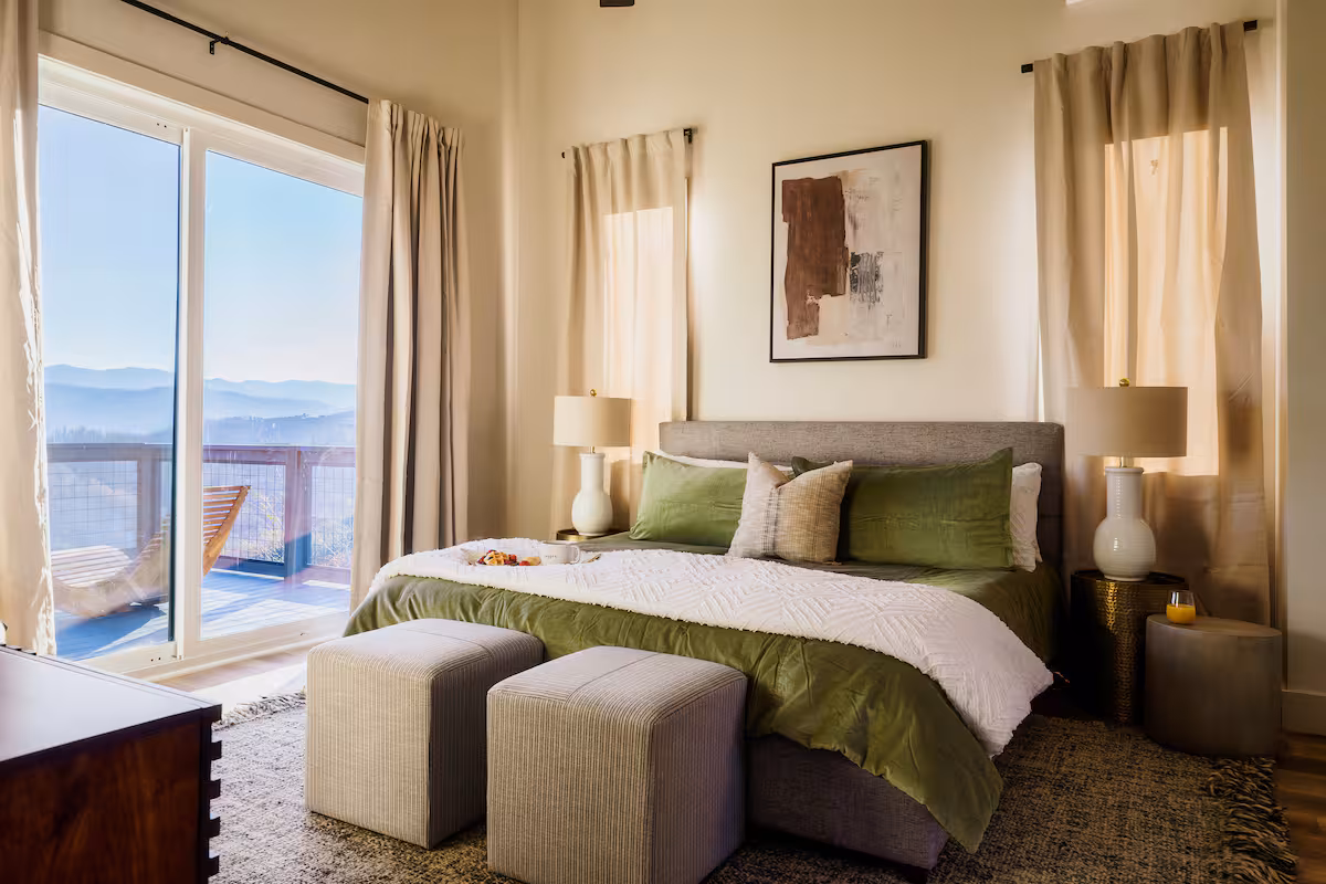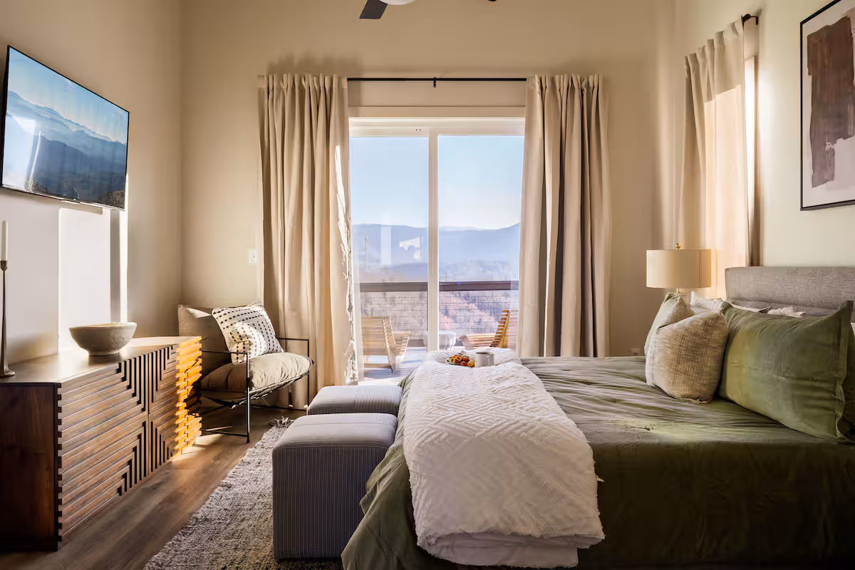 King Bedroom 1: Wake up to stunning mountain views from the comfort of your bed. Enjoy your morning coffee or evening beverage on the private back porch. A luxurious ensuite bathroom with a freestanding tub and separate shower awaits.