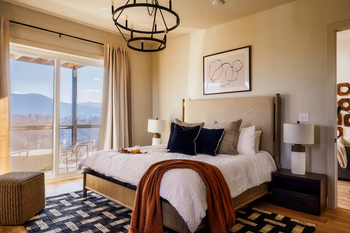 King Bedroom 2: This bedroom boasts the same incredible mountain views as the living room, along with a private balcony for enjoying the fresh air. An ensuite bathroom with a tub/shower combo is attached.