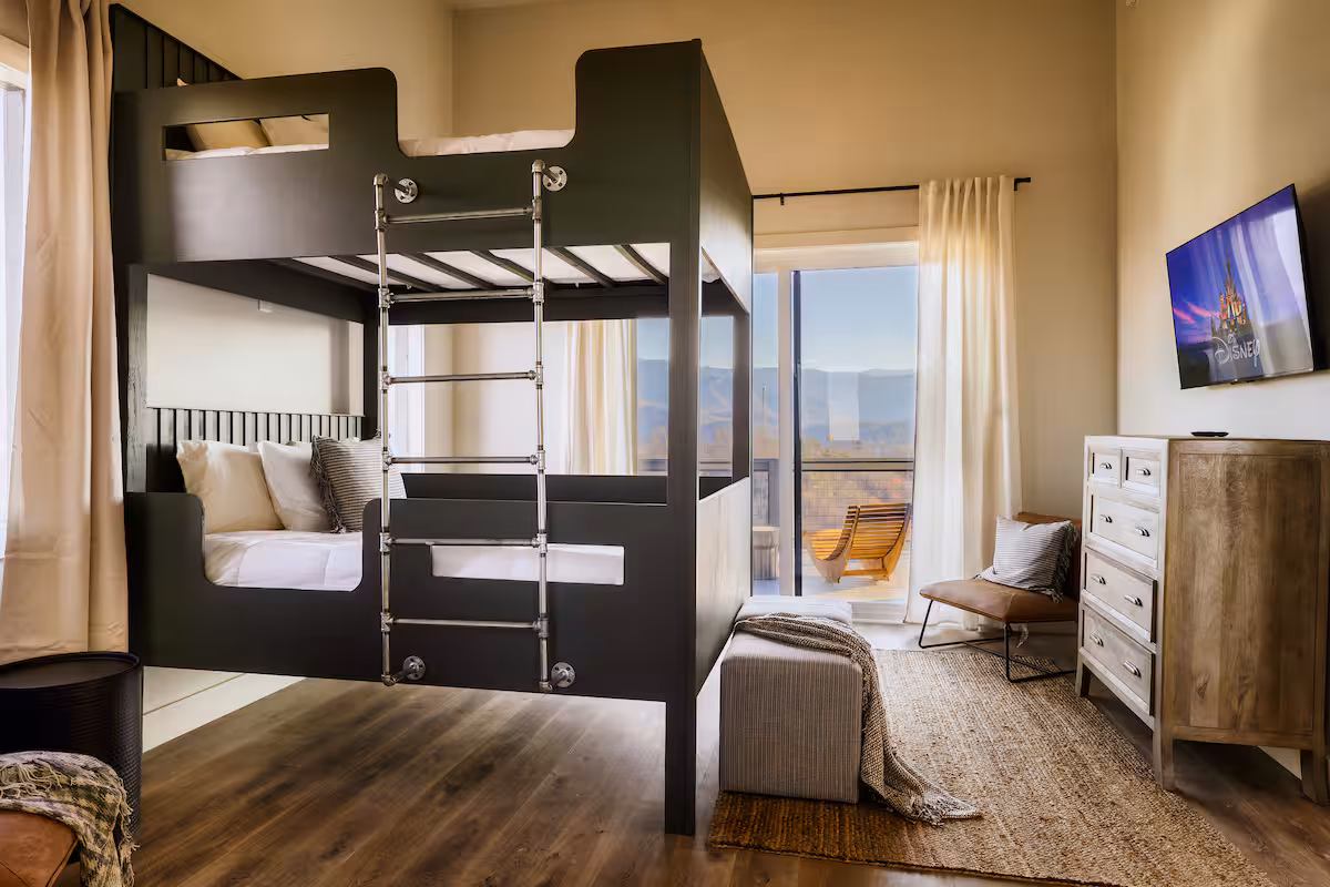 Bunk Room: This room features gorgeous mountain views, a private balcony, and a queen-over-queen bunk bed that sleeps up to 4 guests. An ensuite bathroom with a bathtub and stand-alone shower is also included.