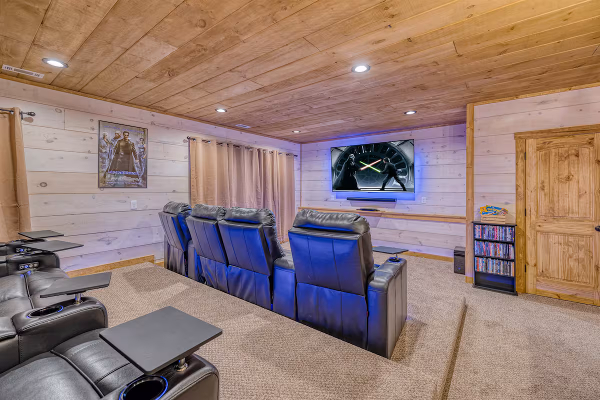 Our luxury, brand new theater room features 8 electric reclining and light up chairs that even have trays for your snacks! There is a gorgeous, live edge bar which seats 6 – plenty of room for everyone to enjoy a movie on the 86″ TV. The theater room is also equipped with a SONOS sound system and surround sound.