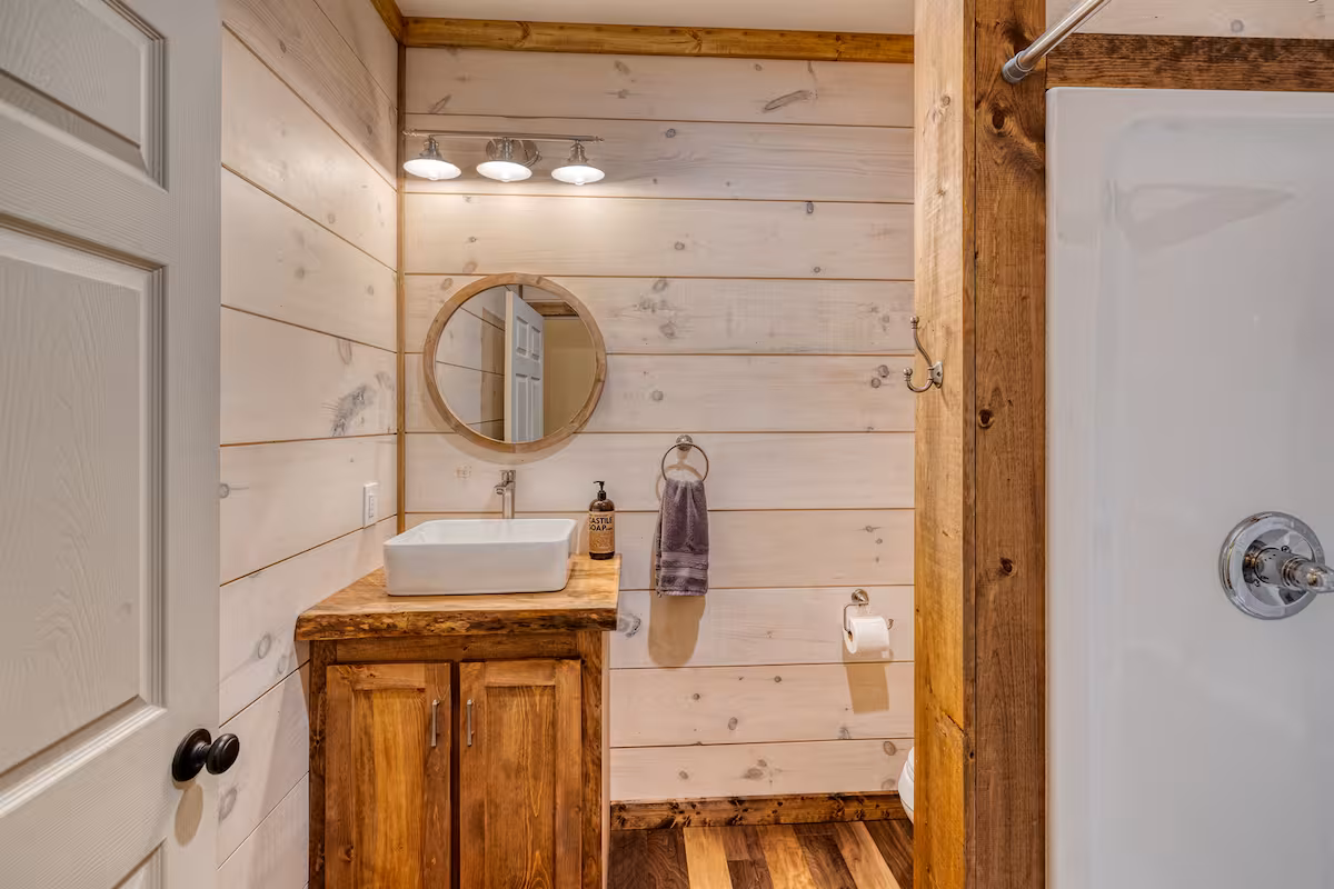 The main floor of the cabin features a beautiful farmhouse kitchen with granite counters and a butcher block island. The kitchen is well stocked with dishes, appliances, and plenty of counter space, you will enjoy cooking family meals here…even on vacation!