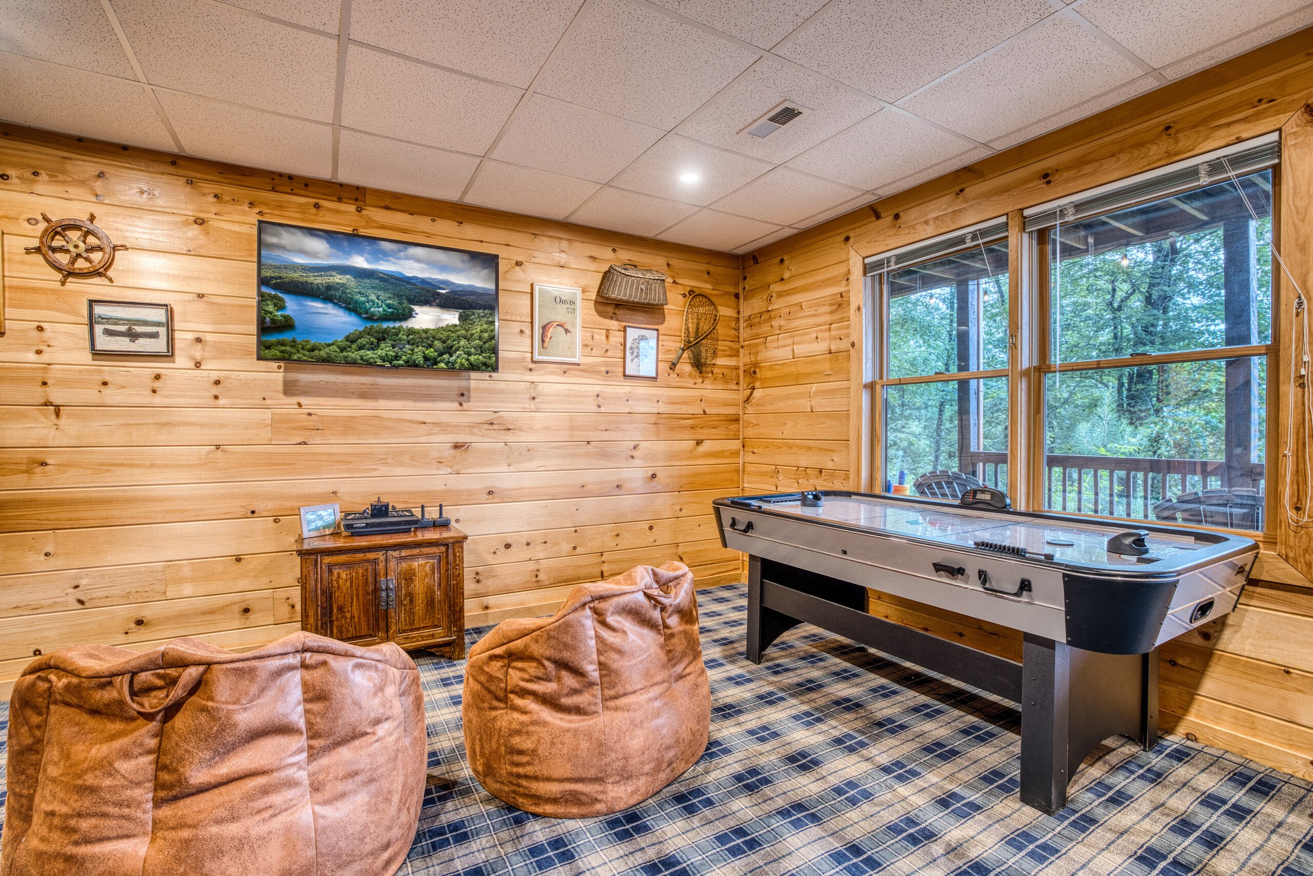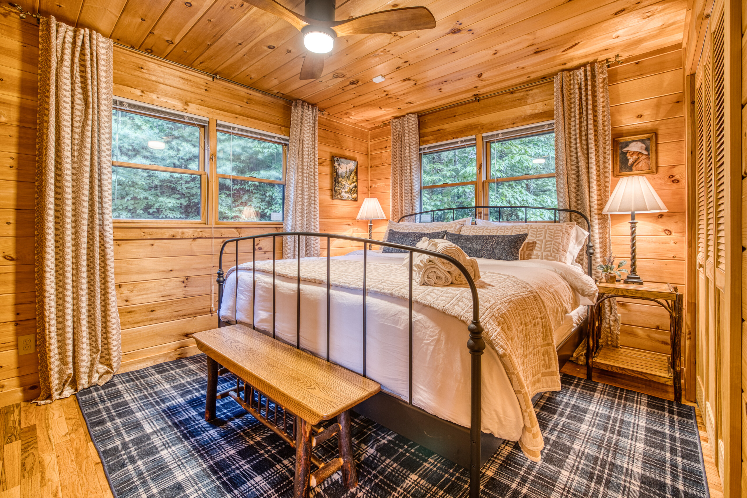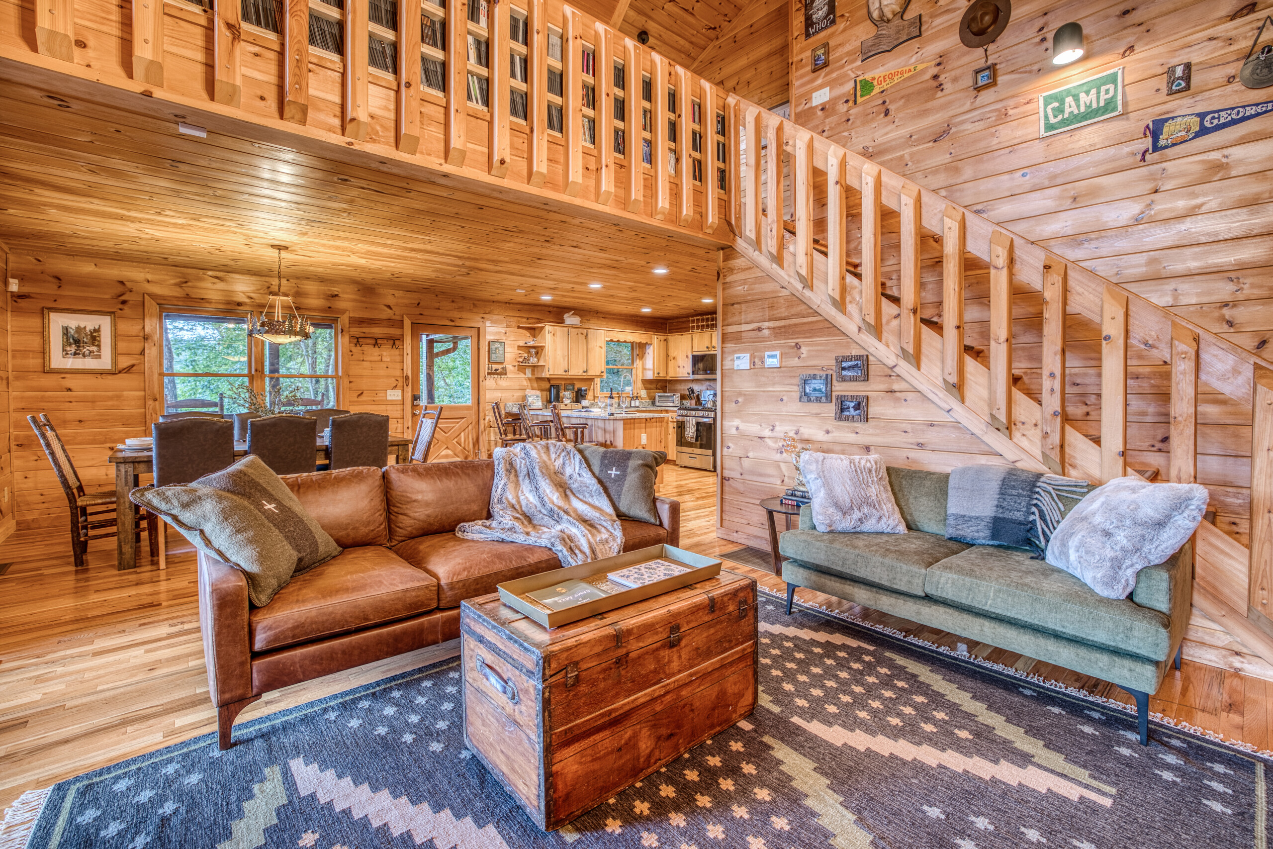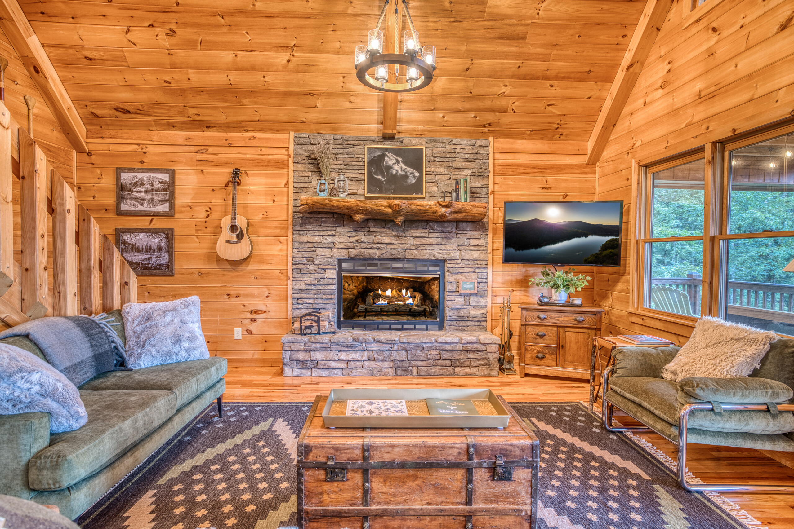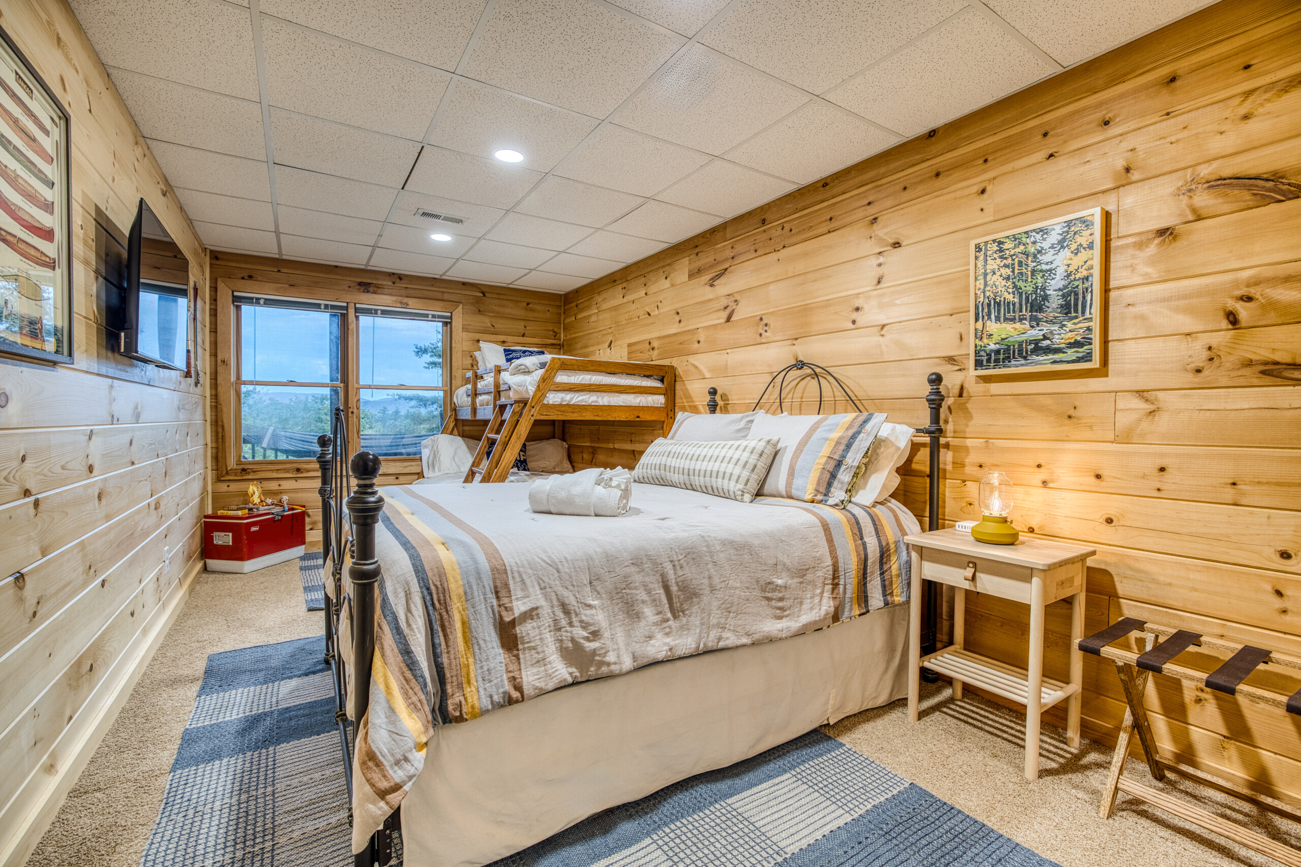 The vintage camp-inspired décor sets the scene for fun, while amenities like a tankless water heater (hello, hot showers!), fast fiber internet, and Roku TVs throughout the cabin offer modern everyday comfort.