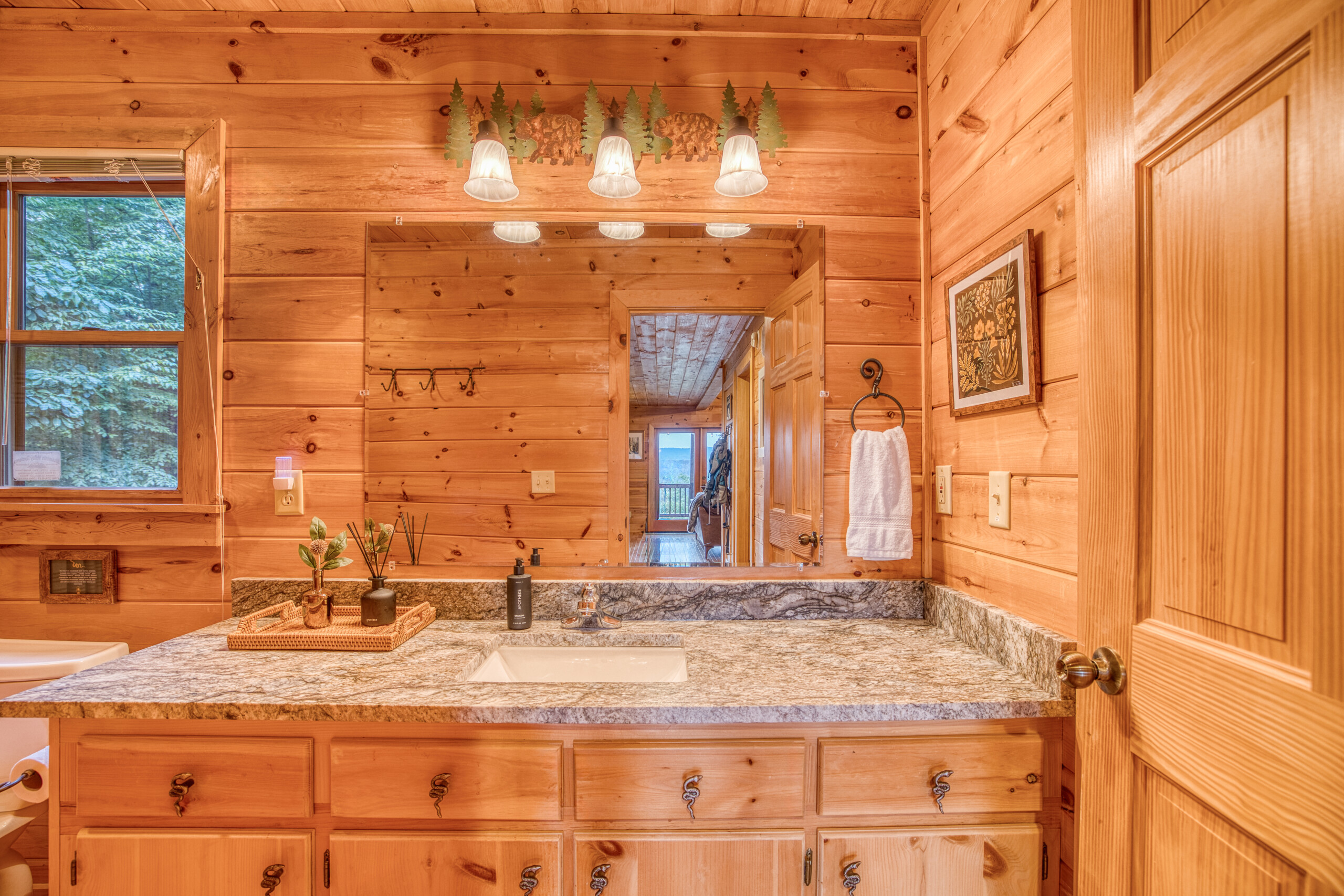 This spacious cabin features 3 bedrooms plus a cozy loft and 3 full bathrooms, comfortably sleeping up to 10 guests. With a thoughtful layout—one bedroom and one bathroom on each level—it’s perfect for families or groups seeking both togetherness and privacy. There are two king bedrooms (one on the main level, one on the loft level), a loft queen bed (in the open loft area), and a lower-level bedroom with a queen bed and a twin-over-full bunk bed.