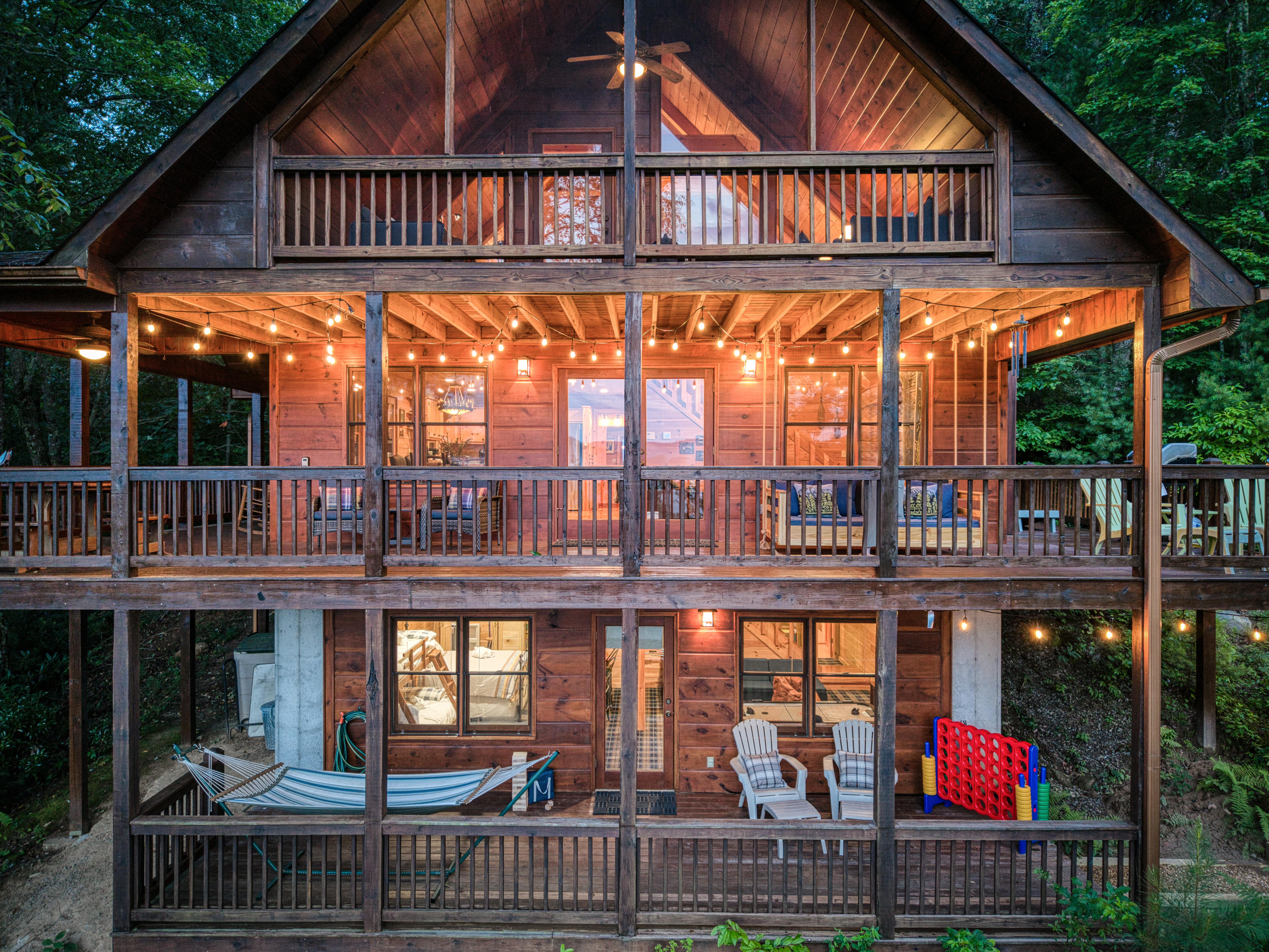 Outdoor living shines at Camp Aska! Enjoy morning coffee or a nap in the hammock on the lower deck, curl up with a book on the cozy outdoor couch and chairs on the screened-in loft level deck, or relax on the daybed porch swing on the main level gated wraparound porch—where kids and pets play and adults relax. Take in the beautiful year-round mountain views and seasonal river views from decks on each level!