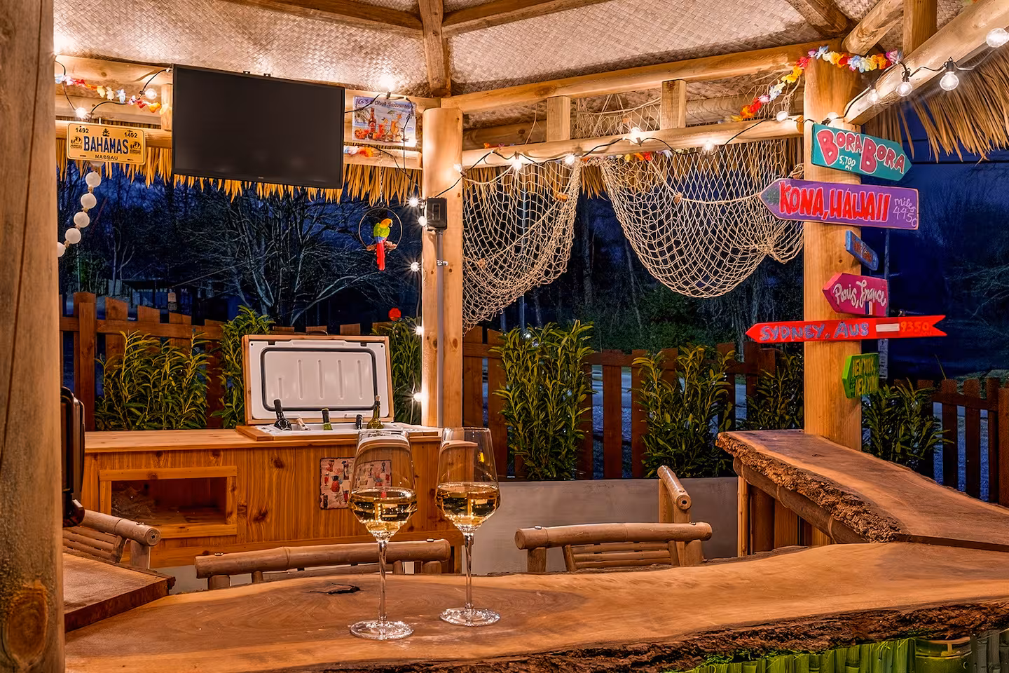 An authentic Tiki Hut next to the pool, perfect for watching the game or enjoying drinks.