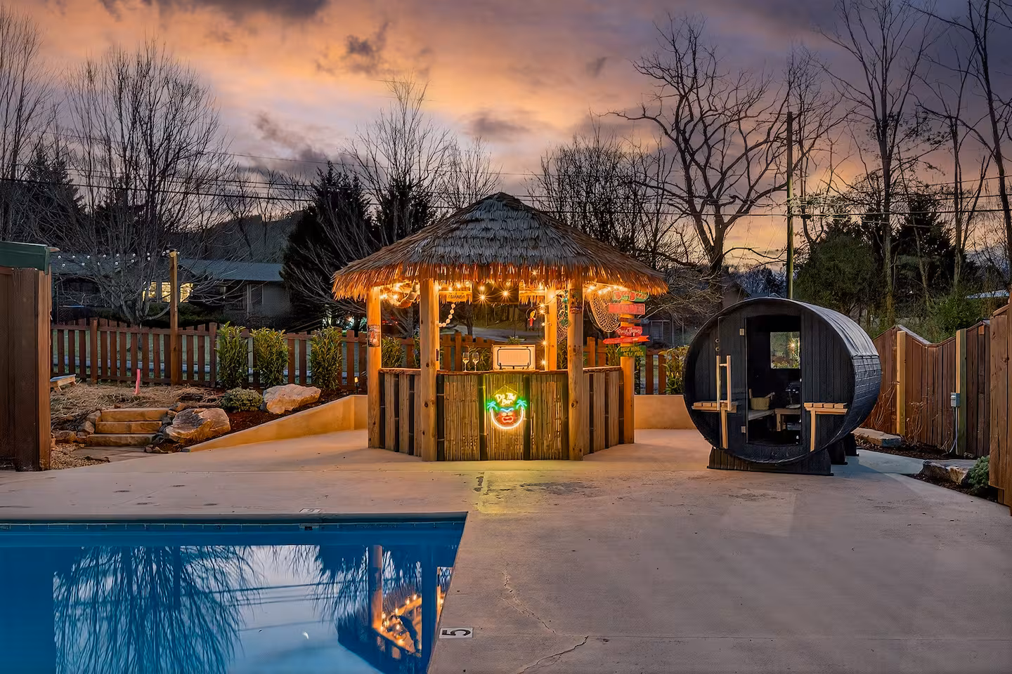 The ranch includes a newly heated, enormous Swimming Pool, Commercial Pool Basketball Hoop, Lounge Chairs and Areas for Sunning, Chess Table Setup, Full Volleyball Court, 2 Man Arcade System, 6 Person Authentic Barrel Sauna, Fairy Light- Zen Nook for Reading/relaxing, Open- Air Outdoor Ping Pong Room, Resort Style Firepit and Seating, Hot Tub, Air Hockey Table, Cornhole under string lights and let’s certainly not forget our Authentic TIKI Hut-Perfect for enjoying the pool area, watching the game or visiting with friends and family in one of the Coolest Locations in the Mountains.