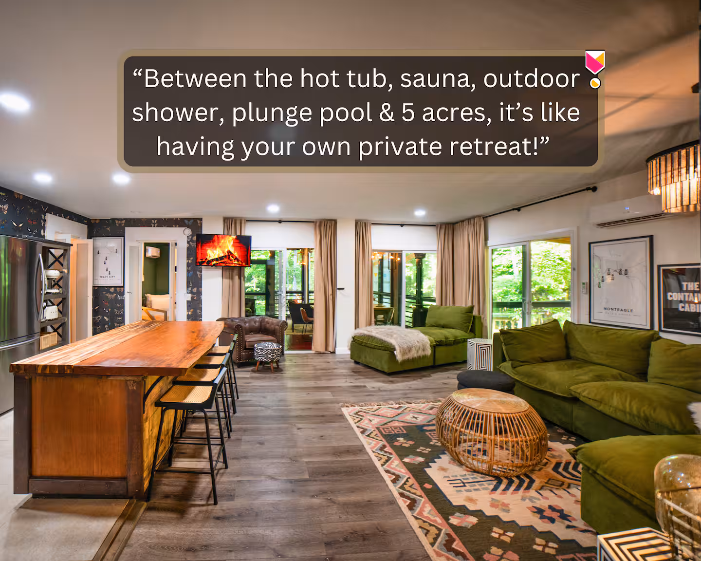 PRIVACY & TOGETHERNESS: Our home is ideal for multiple families looking for a space to be together while still having privacy when needed. The home features a large open concept living/kitchen area to be together in the ‘main cabin’ as well as 3 additional private guest quarters for couples to escape to at the end of the night.
