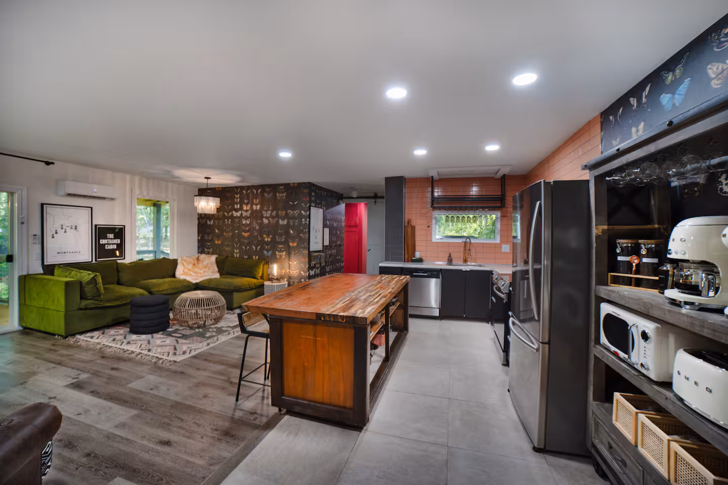 FIRST TIME STAYING IN A SHIPPING CONTAINER HOME? You’re not alone! We get tons of questions – Many asking, “Is this a ‘normal’ home?” – The answer is, yes! The outside looks extremely unique, but we imagine that once you’re inside, you’ll forget you’re in a shipping container because of the comfortable design and luxe touches added throughout the home. Split units keep our home cool in the summer and warm in the winter. Please note, all of the bedrooms are single containers and therefore, are narrow. The photos show this as the containers are the width of queen/king size beds. Additionally, this is still a cabin in the woods! It is an upscale cabin, yet imperfect. If you are looking for hotel quality perfection, please consider booking elsewhere.