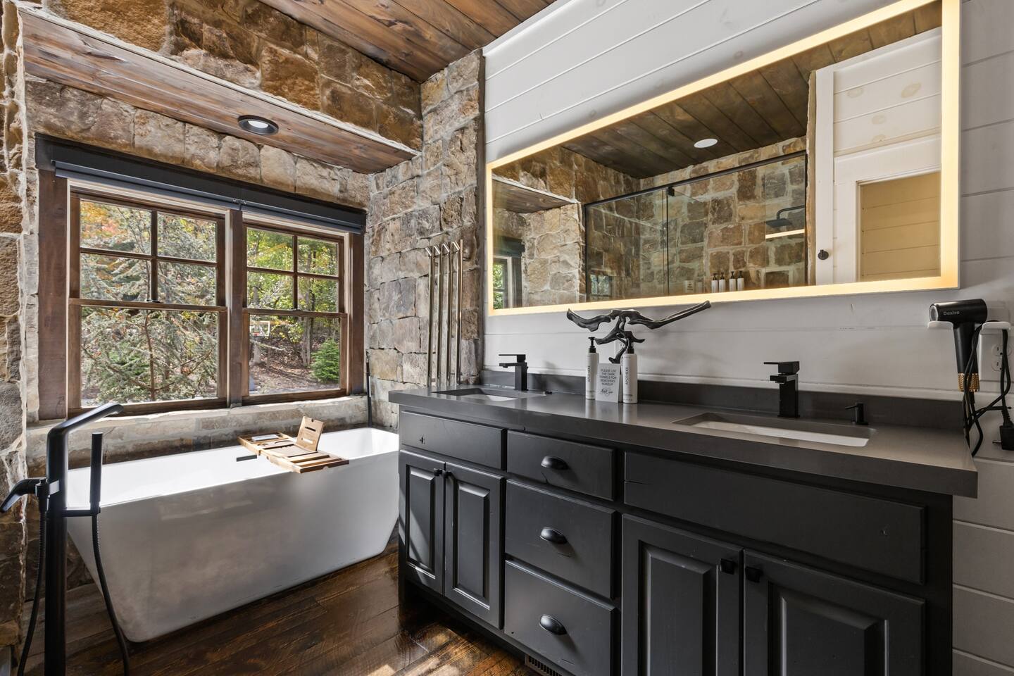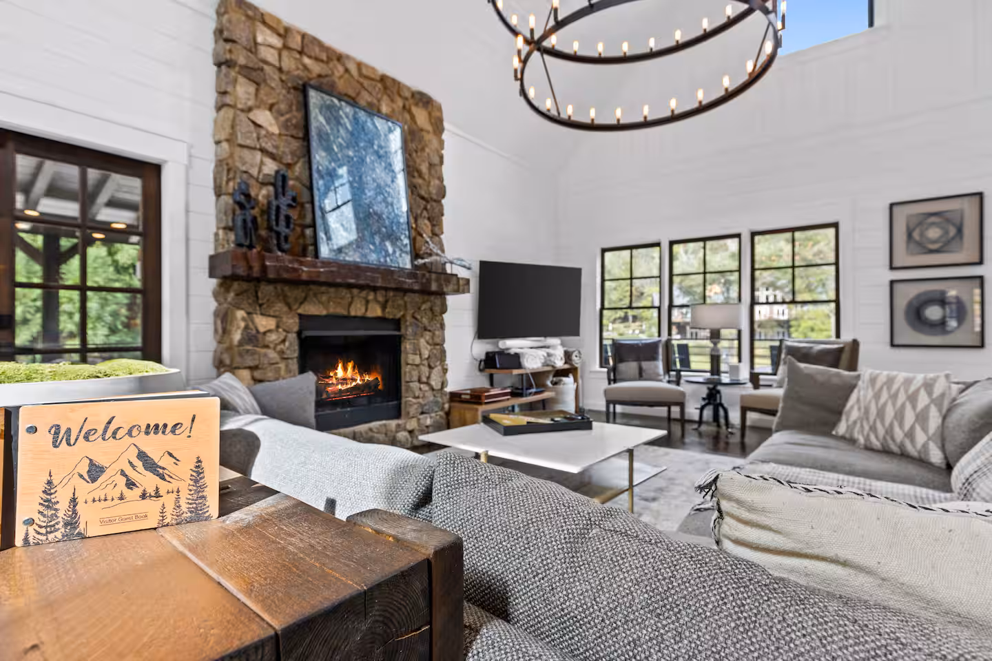 Inside, the cabin features soaring ceilings, hardwood floors, and a fully stocked gourmet kitchen ideal for family meals. A formal dining area flows into a cozy living space anchored by a dramatic floor-to-ceiling stone fireplace, blending luxury with mountain warmth.